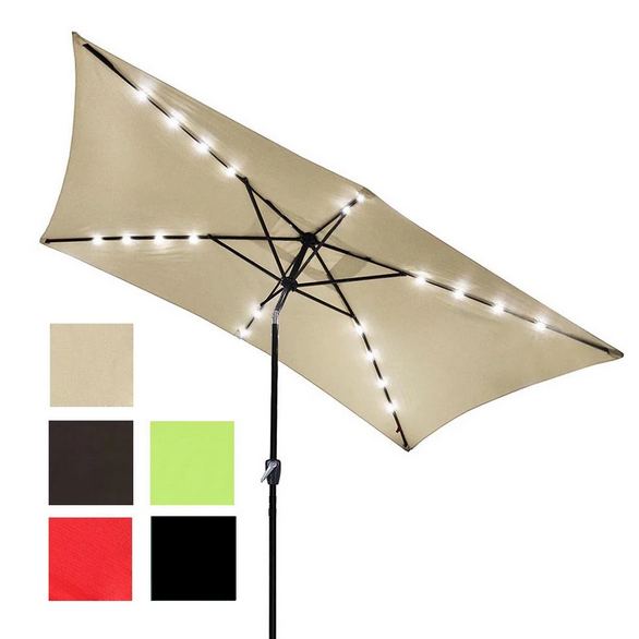 Solar Rectangle Outdoor Tilt Patio Umbrella The 10'x6.5' Patio Solar Umbrella blocks the sun's rays throughout the day, and lights up the night with its pre-installed solar-powered LEDs. So, no matter day or night, you can enjoy relaxing get together with this auto tilt solar umbrella. As a great companion, our solar umbrella can prevent from the sun's rays or rainwater and provide perfect protection for you. Get one and enjoy your life with it !! |
