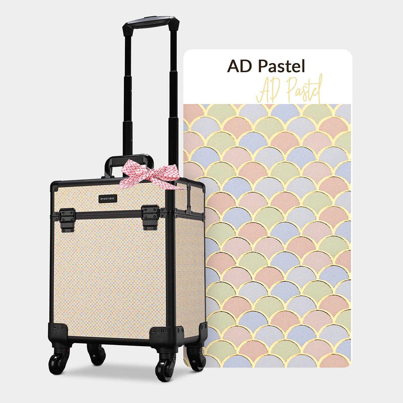 Byootique makeup train case on wheels with meticulously arranged Art Deco fan motif, transforms everyday into an exquisite work of art. Its extendable trays and large compartment provide ample storage for beauty essentials, making it ideal for professional makeup artists, beauticians, wedding stylists on the go.