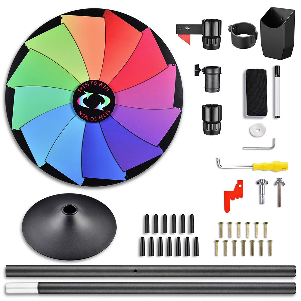 WinSpin 36" Color Prize Wheel can be placed on the tabletop or floor, making it a perfect parter for party planners or carnival organizers, etc. Also, its big customizable board is perfect for logo or text or image to meet diverse demands. Don`t worry! The text on prize wheel board can be easily cleaned!
