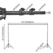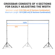• Each backdrop stand includes 4 x 29" Section crossbars: width can be adjusted from 59" to 118", you can combine 2 or 4 sections to fit you well; 2 Tripods: height can be adjusted from 27 9/16" to 82 11/16" to meet your different needs (more stable within 72")