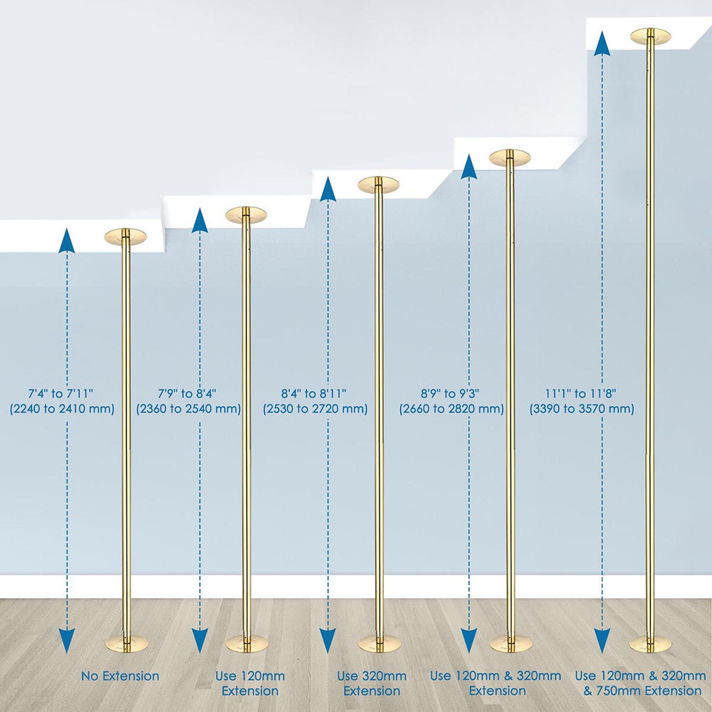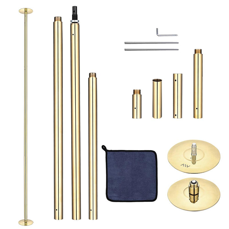 Yescom Dance Fitness Pole features adjustable height to fit for ceiling heights from 7 1/4 to 11 6/12 ft, and it is easy to install without any drilling required, suitable for home, club, disco, party, live and other occasions. Dancing pole with golden color that shines in the light, a great gift to dance lover, fitness lover.