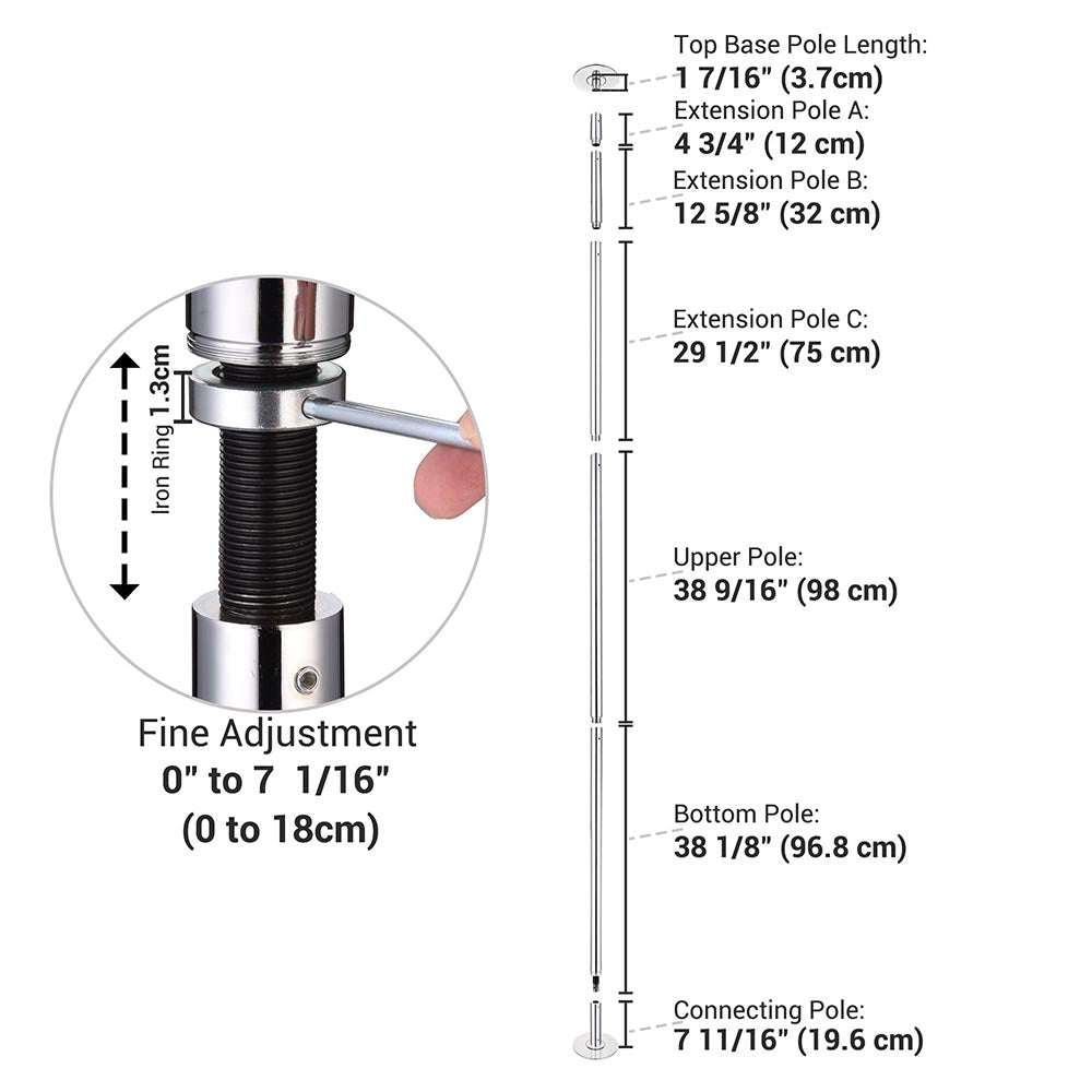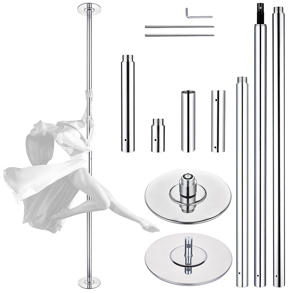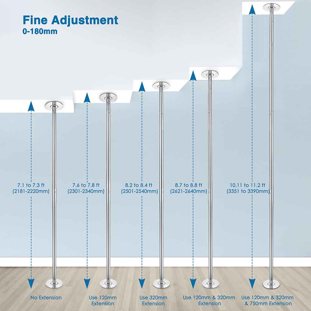 Yescom spinning dancing pole is easy to put up and take down, no-drilling needed and does no harm to your ceiling; the height can be adjusted with 3 extension poles to accommodate different ceiling height from 7'4" to 11'8".