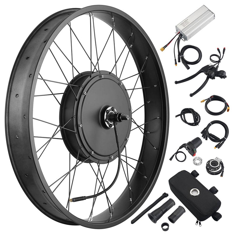 Yescom Electric Bicycle Motor Front Wheel Fat Tire Kit, includes 26" motorized wheel(not includes the tire), 48v 1000w motor, speed throttle, power break lever, wire harness, pedal assist sensor, etc. The powerful motor allows the speed up to 28 MPH (45KM/H). Fit for 5 5/16" front dropout spacing and 26"x4" tire