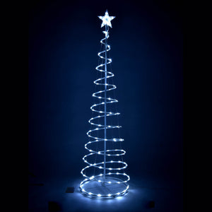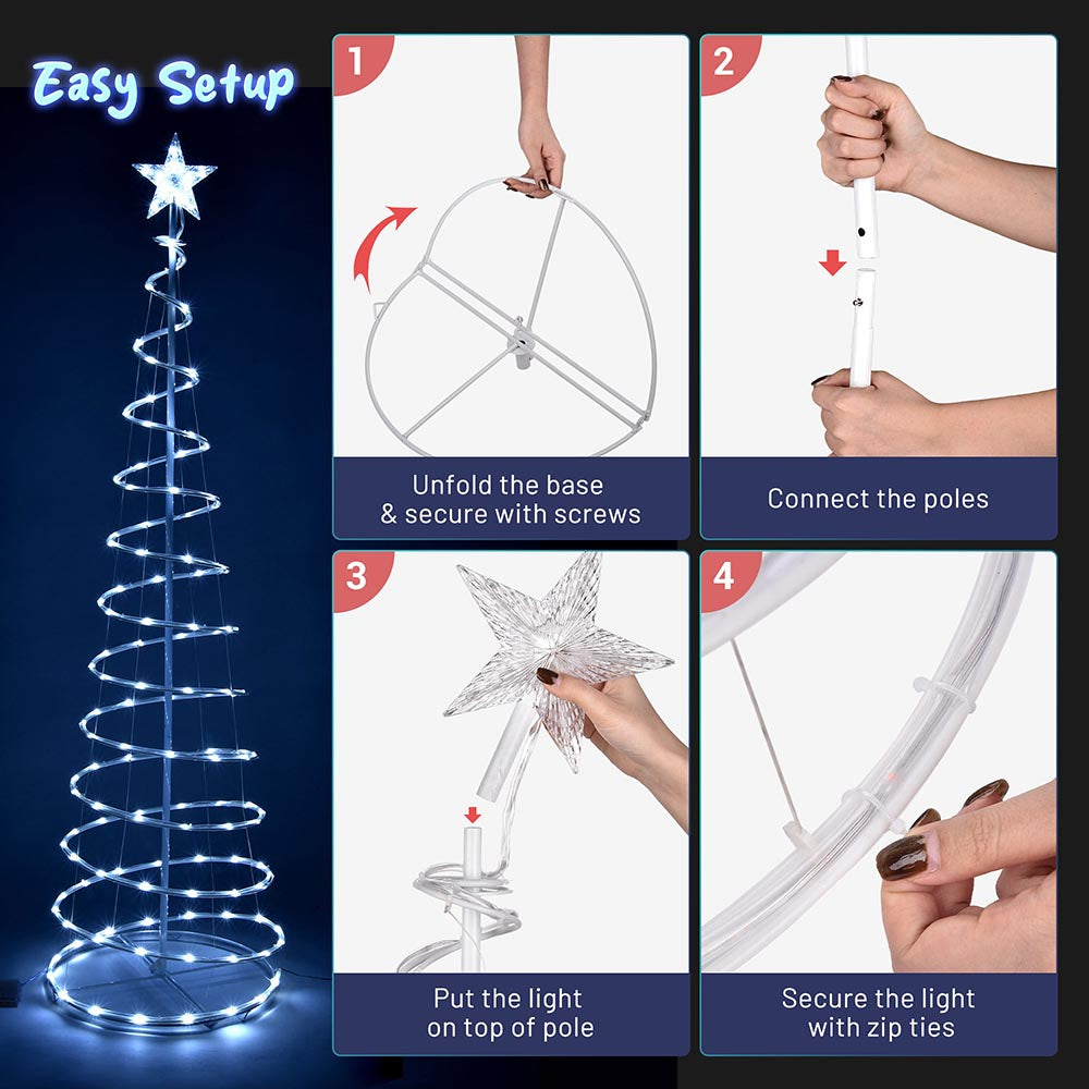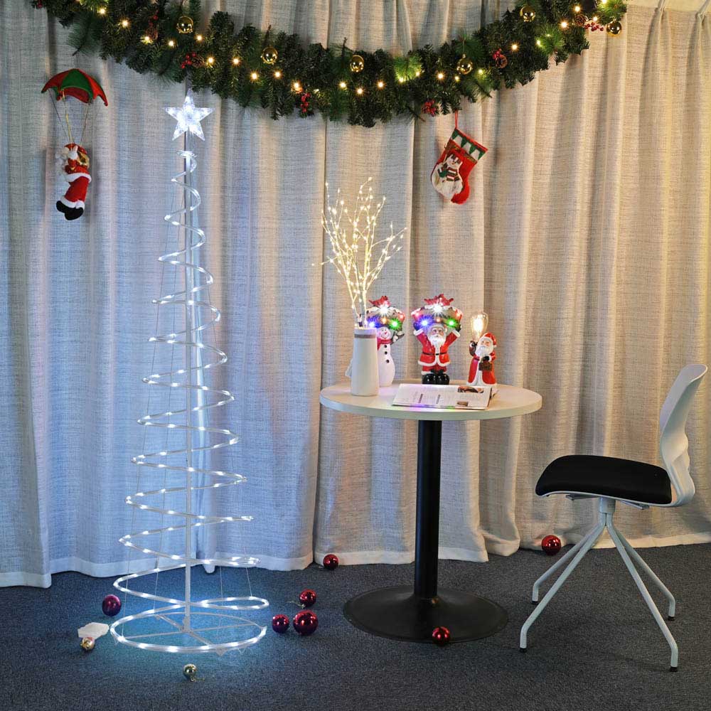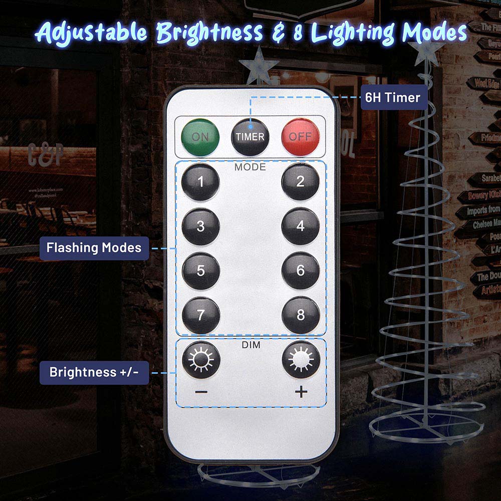 6 ft LED Spiral Tree Light with 182 pcs LEDs presents the shape of Christmas tree, providing steady-on and twinkle modes to add holiday charm to any indoor/outdoor space. This lovely and fun flashing Spiral Tree Light is powered by battery for great mobility, a perfect festive decoration solution.