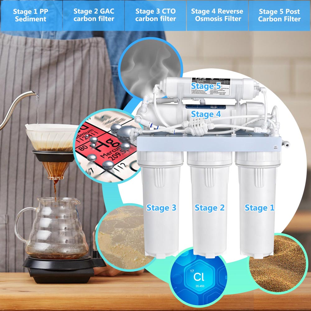 This 50 Gallons 5-stage Reverse Osmosis Under Sink Water Filter Filtration System with Storage Tank is made from best martial to offer fresh, clean, and safe filtered water in your home. It protects you from the harmful effects of lead, heavy metals, chlorine, chemical contaminants. You and your family will have years of enjoyment and good health with it.