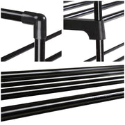 This 4-Tier Shoe Rack consisted of painted metal tubes and PP connectors is sturdy, durable and rust & corrosion resistant. It can store 16 pairs of mens' shoes and sneakers or 20 pairs of heels and each tier can load up to 23lbs. It is easy & quick to assemble and perfect for household use!
