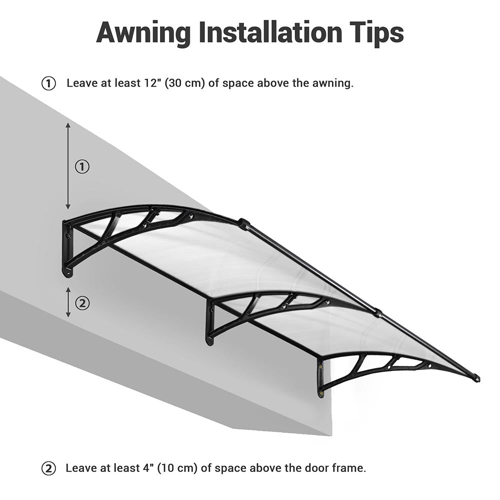 6.5ft Patio Awning is made with 2 complete clear hollow polycarbonate sheet with UV protection and strong plastic alloy brackets that can protect your entry doorway or windows from UV rays, rain or light snow. Synthetic materials Awnings can easily be trimmed to your required width with good weather resistance, safe, easy and ready to install.
