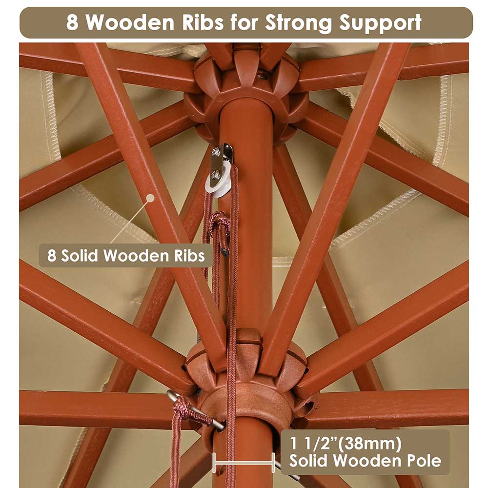 Contemplating to enjoy the warm weather with some patio dining and experiencing bright sunny rays shining, enjoying the outdoor experience, or adorn your romantic affair with more simplicity? You definitely can! This 9ft Solid Wood Umbrella can help you make your dreams come true! Our bright visionary umbrellas w/ Solid Wood texture balances well making this wood umbrella perfect to enjoy the surrounding green trees and gentle breezes in gardens, patios, wedding ambiances, swimming pools, sandy beaches, lakesideor lakeside.