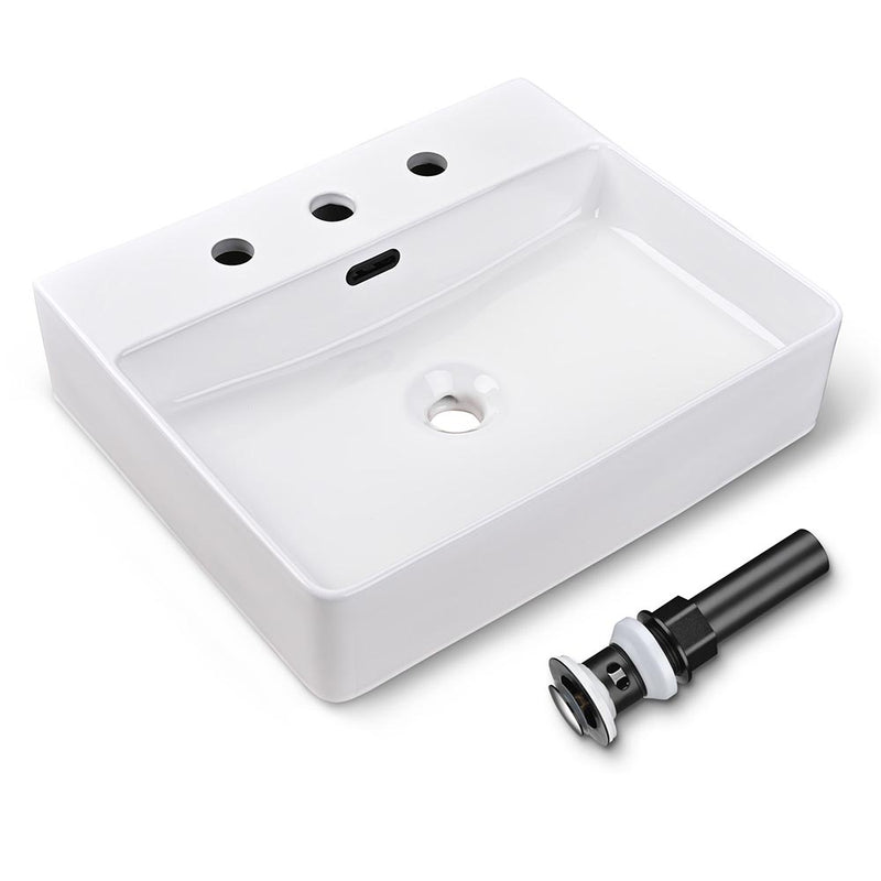 Aquaterior 20 1/16" x 16 3/4" x 5 1/8" rectangle countertop ceramic vessel sink features 3 faucet holes for easy installing faucet and handles on the sink. It features glossy surface and clean and smooth lines for bringing modern style and matching well with different bathroom decorations.