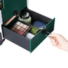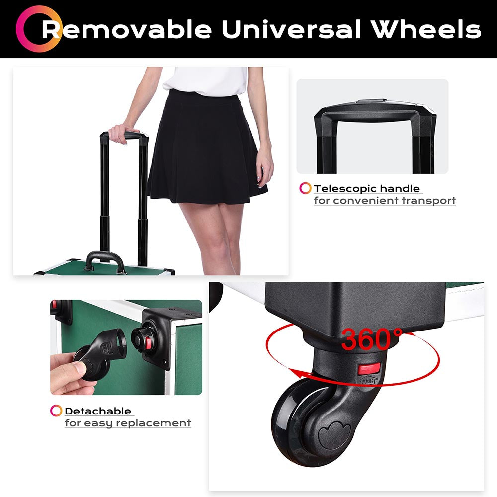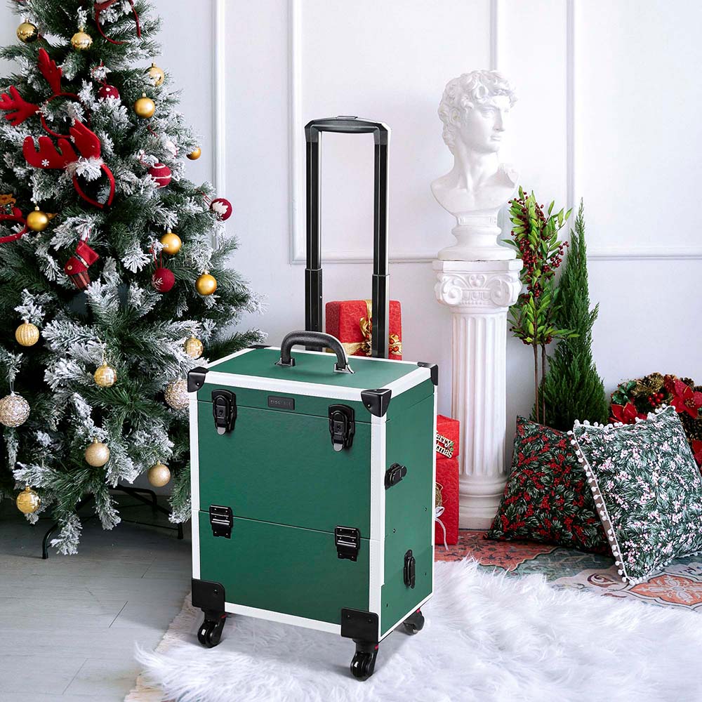 15"x10"x18" Portable Rolling Makeup Train Case in emerald green features extendable trays and removeable side drawer for storing cosmetics and tools in good order, which is ideal for makeup artists, nail stylists, freelance beauticians.