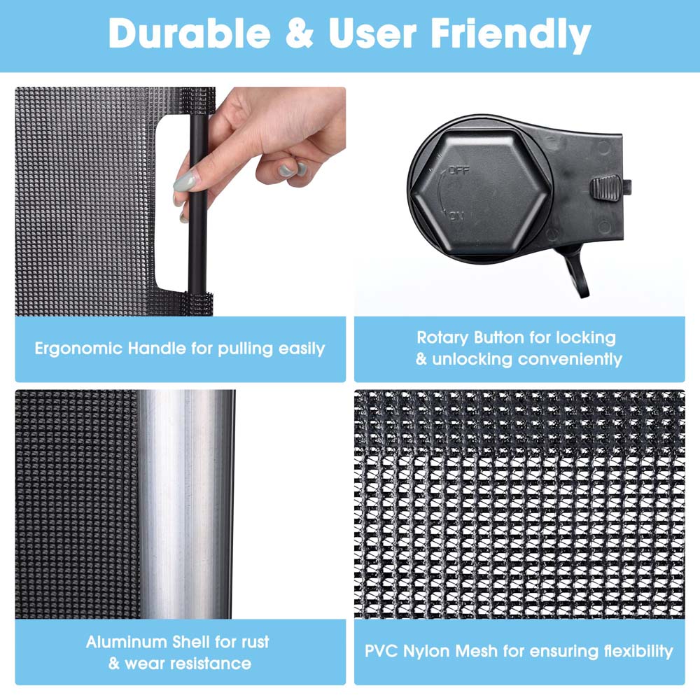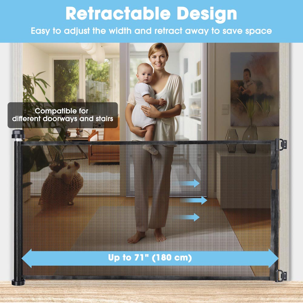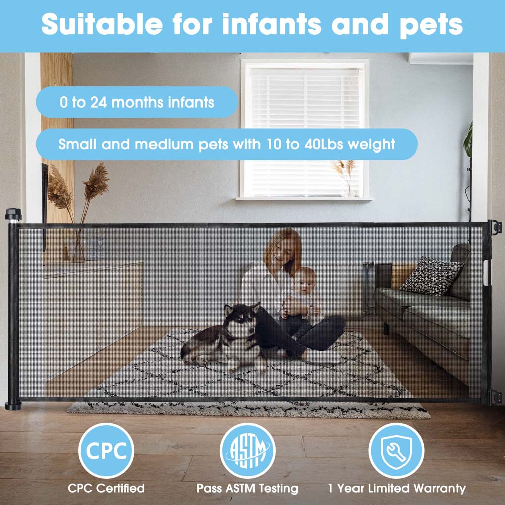 71"x33" Indoor/ Outdoor Pet Gate also suitable for baby safety gate. Retractable dog gate comes with installing accessories for easy assembly and can be operated with one hand, while its durable construction ensures long-lasting protection.