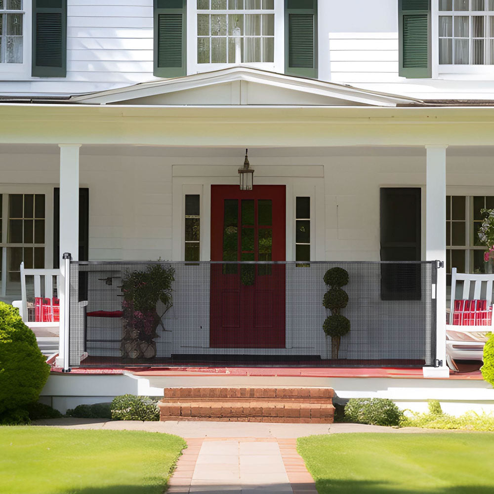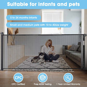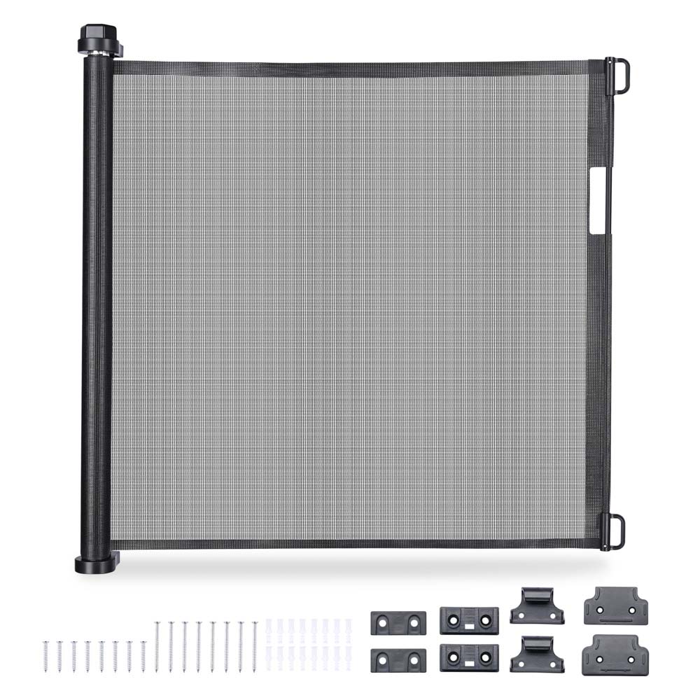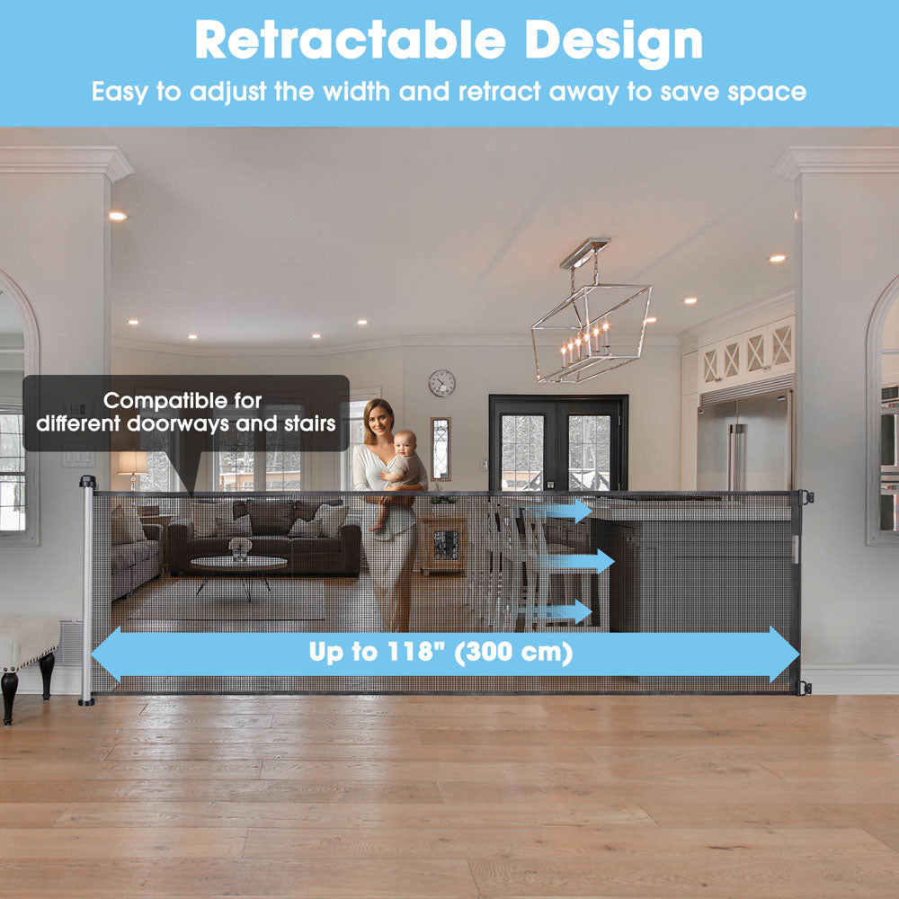 118"x39" Indoor/ Outdoor Pet Gate also suitable for baby safety gate. Retractable dog gate comes with installing accessories for easy assembly and can be operated with one hand, while its durable construction ensures long-lasting protection.