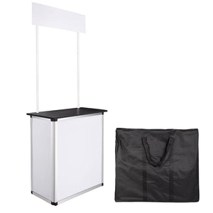 This foldable promotion counter is portable and easy to set up. It is constructed of plastic and has an aluminum framework for extra strength and stability. It makes a great addition to any trade show exhibits, traveling presentations, or in-store displays.