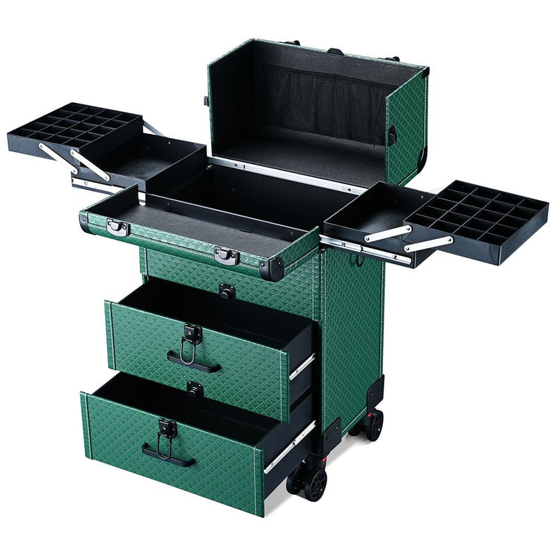 15"x12"x26" Yescom Portable Rolling Makeup Train Case features extendable trays and 2 drawers for storing cosmetics and tools in good order, which is ideal for professional makeup artists, nail stylists, freelance beauticians.