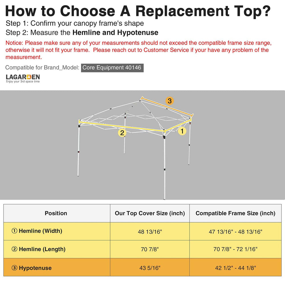6x4 Ft Replacement Canopy Top with Half Sun Wall Instant Canopy Top Cover is specifically made for 6x4 ft Core Equipment straight leg canopy frames only. Crafted from flame-retardant fabric, it provides UV50+ protection and water resistance for outdoor events.