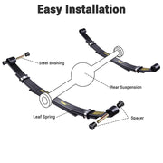 Yescom 2 PCS Rear Leaf Springs 3-Leaf Kit allows your cart to perform better with the added weight of passengers or cargo. This kit including bushings and spacers fits for Club Car DS Models.