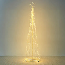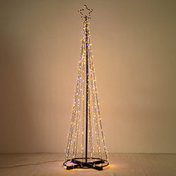 Illuminate your outdoor space with the Christmas Cone Tree Light. Powered by solar energy, it features 640 LEDs and offers 8 preset lighting effects for a festive touch. The upgraded cross base and 4 stakes provide extra stability for any outdoor scenario. Perfect for patios, restaurants, cafes, stores, decks and more.