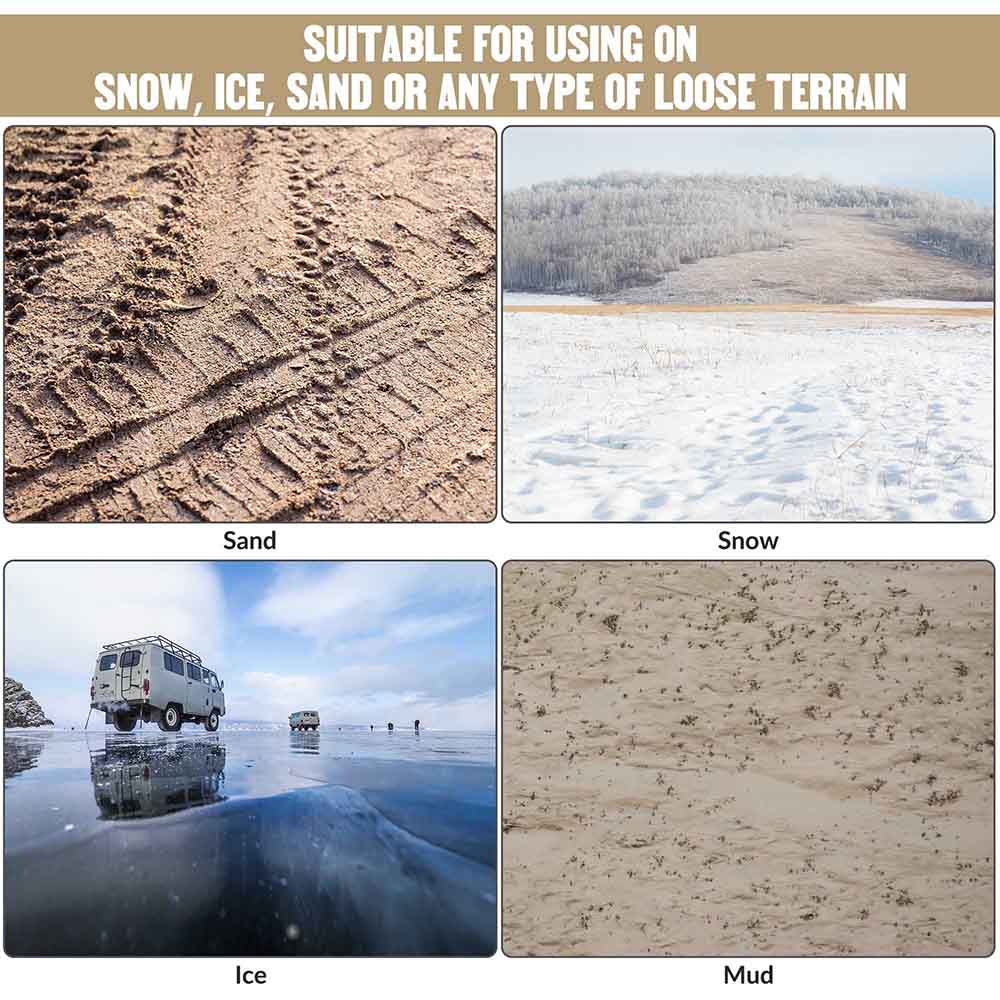 2pcs Off Road Traction Boards Tire Traction Mat comes with a carrying bag for easy storage & carrying and a pair of gloves for keeping hands clean doubles up as a handy shovel, it can prevent your vehicle's tires from spinning when stuck in snow, mud or sand.