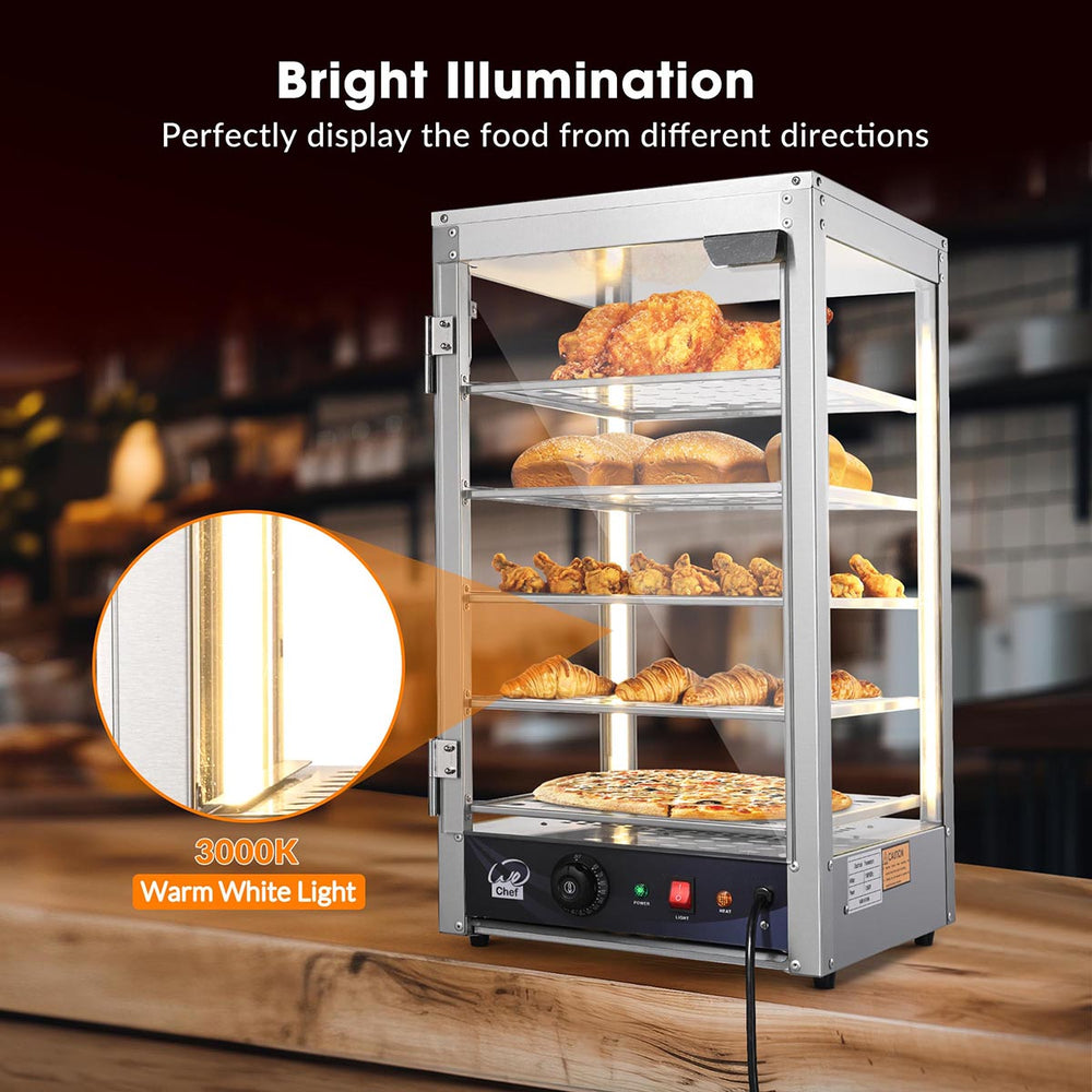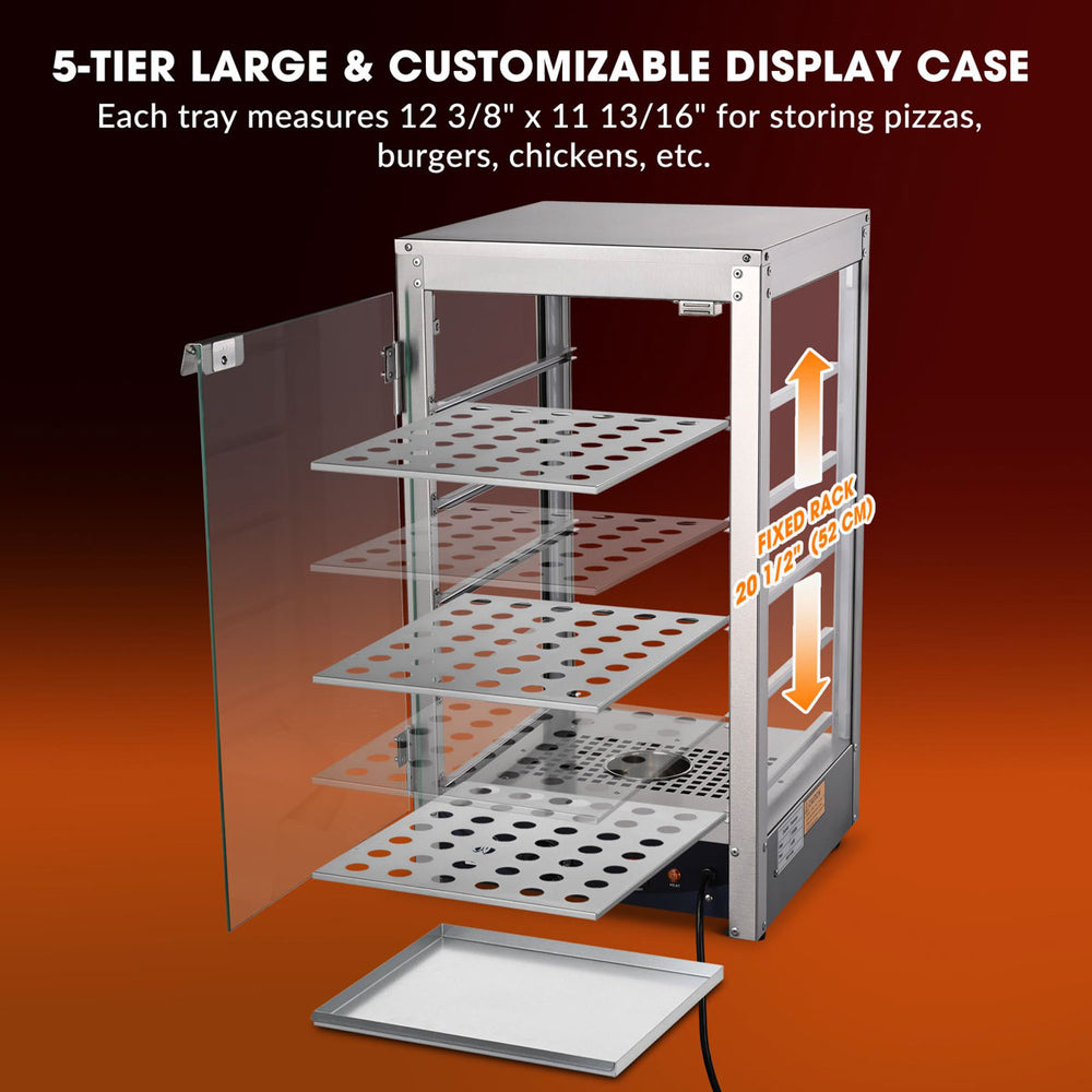 Yescom 600W 5-Tier Commercial Food Warmer with a size of 15"x15"x28" provides ample space for food on each shelf. With LED light on the side rack, your food will look even more appetizing. The temperature can be adjusted from 60 to 185 degrees Fahrenheit, making it perfect for warming pizzas, burgers, chicken, etc.
