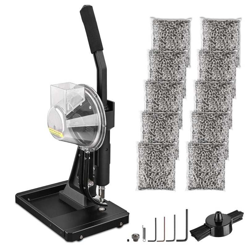 A high-efficiency semi-automatic grommet machine with automatic feeding, clear grommet case for inspection, comfortable handle, and 10,000 #2 grommets, ideal for various craft and industrial applications.