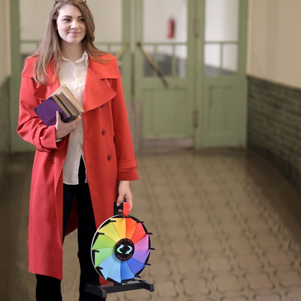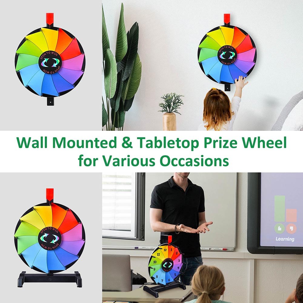 Winspin 12" spinning prize wheel has 2 using ways of wall mounted use and tabletop use with a base, making it possible to use for game playing and teaching. It features a rainbow-like template with 12 customizable slots for logo or text to easily organize various awards or numbers according to different play ways, getting more attractions at home, classrooms, party, etc.
